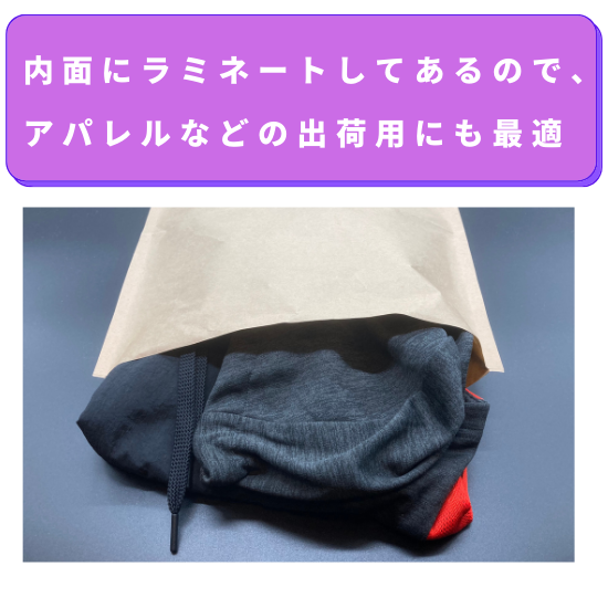 底マチ50mmの設計は、アパレル商品の収納に最適で、商品の形状や素材を損傷から守ってくれます。また、防水素材を使用しているため、天候や送料中の湿気から商品をしっかり保護してくれます。使い勝手の良さとコストパフォーマンスの高さが魅力の一つです。